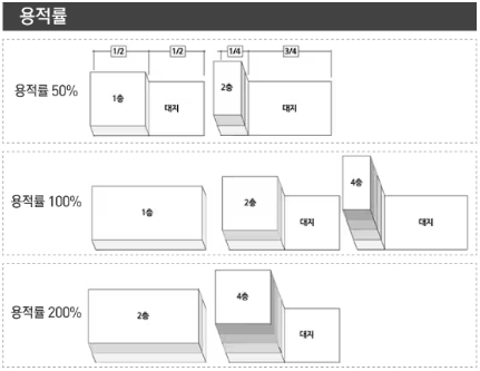 | 용적률 | (연면적 ÷ 대지면적) × 100 | 연면적 = 각 층의 바닥 면적 합계 |