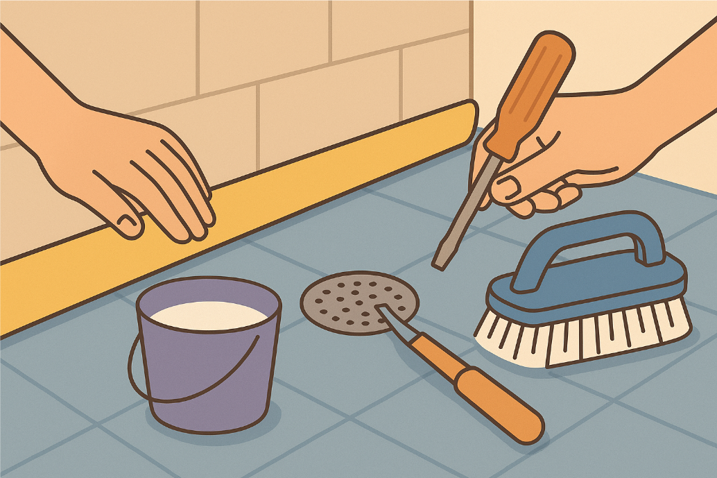 배수구 쪽 바닥이 평평하거나 오히려 경사가 반대 방향이면, 물이 잘 빠지지 않습니다. 간이 수평자나 스마트폰 앱으로 경사를 확인해보세요. 바닥에 물이 고인다면, 에폭시나 얇은 타일을 이용한 미세 경사 조정도 효과적입니다.