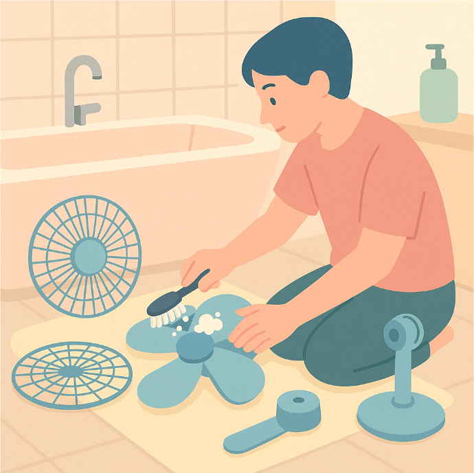 - 미지근한 물에 중성세제를 풀고 날개·그릴을 담가 부드럽게 문질러 닦는다.